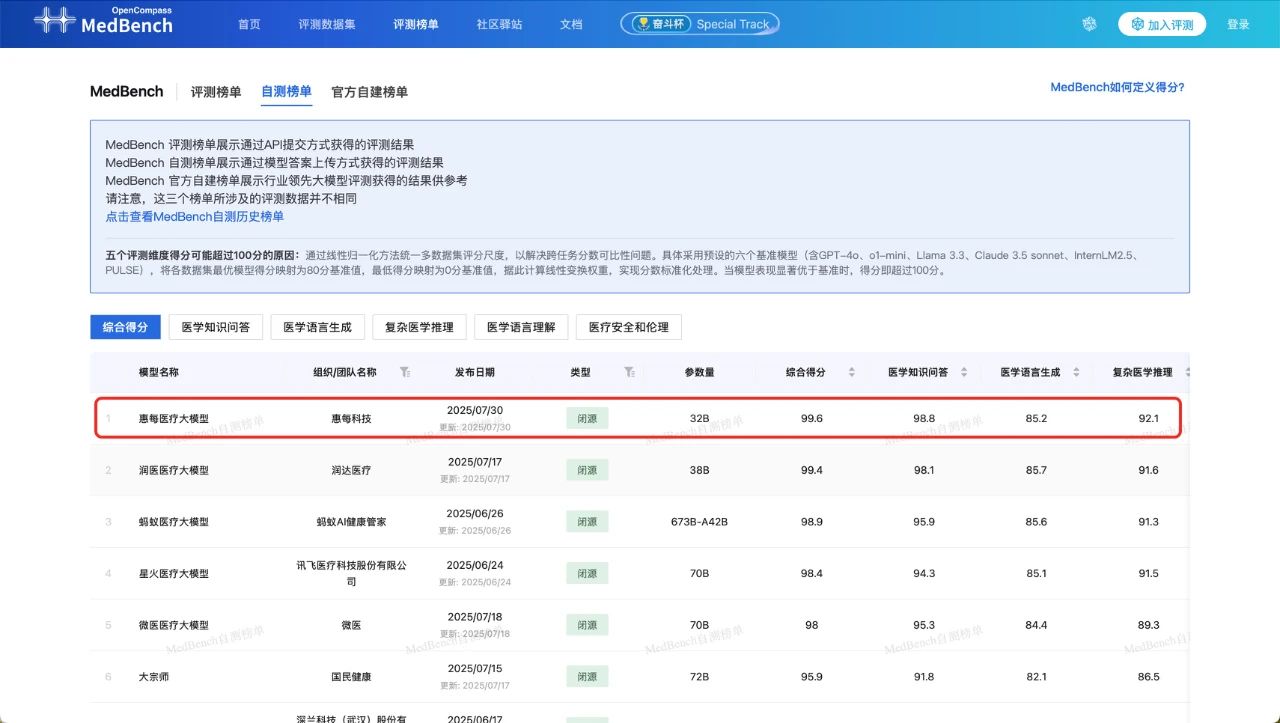 近日,醫療大模型評測平臺MedBench發布新版評測榜單,惠每醫療大模型從近60個參評團隊中脫穎而出,以99.6分奪得自測榜單綜合排名第一名!